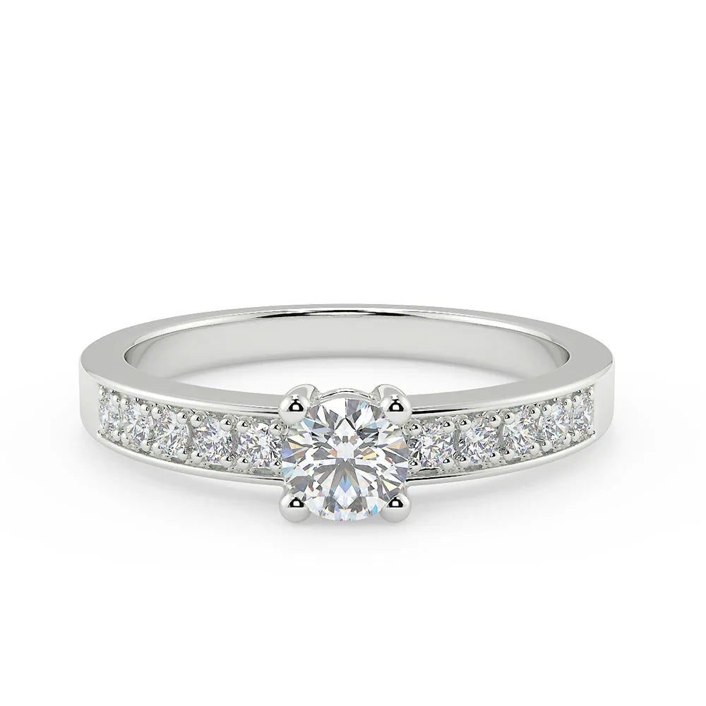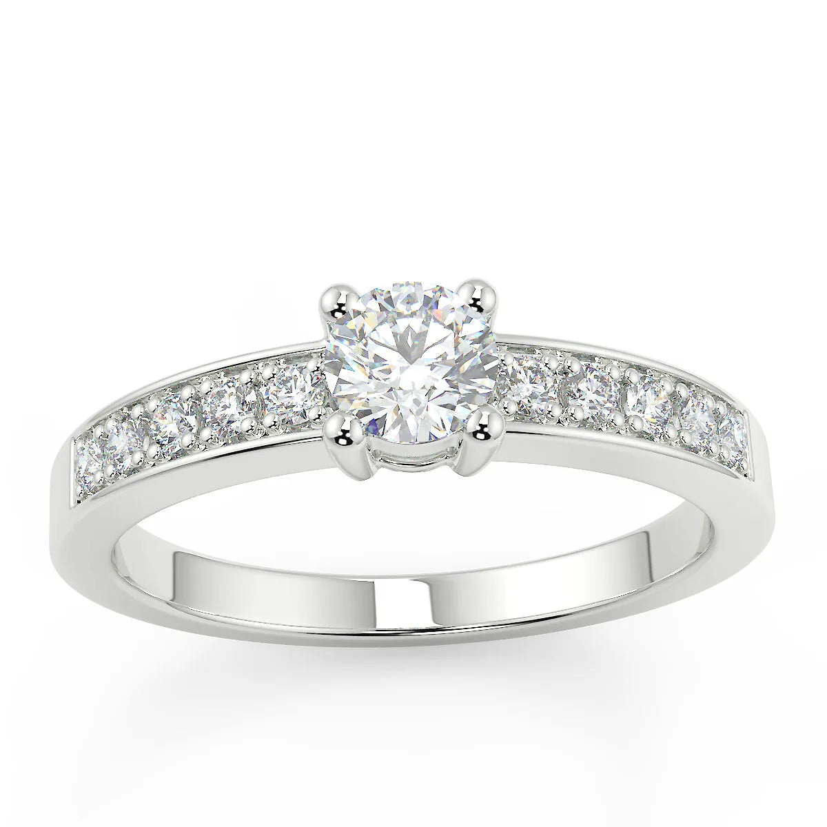 Begin your forever with this exquisite Sparkling Embrace F VVS1 Lab Grown Diamond Engagement Ring. It features a brilliant 0.5 carat round-shaped, F color, VVS1 clarity lab-grown diamond, celebrated for its exceptional fire and ethical origin. The magnificent solitaire is elegantly set upon a radiant 14k gold band, meticulously adorned with shimmering pave-set diamonds along its shoulders. This ring perfectly blends classic beauty with dazzling brilliance, making it an unforgettable symbol of your profound love and commitment, destined to be cherished.